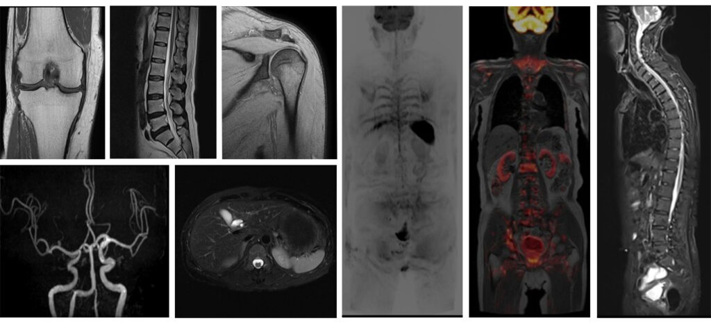 超電導磁石が埋め込まれたトンネルに体を入れ磁石と電磁波によって体の中の情報を解析し画像にします。いろいろな角度から体の断面を画像化することができ、脳、脊髄、臓器、筋肉、関節、血管などの情報を得ることができます。また、X線を使わないため被ばくの心配がありませんが検査中は大きな音がします。